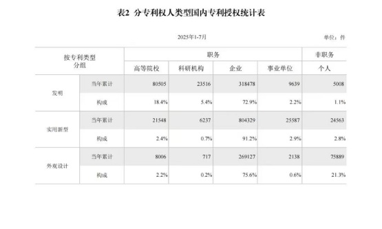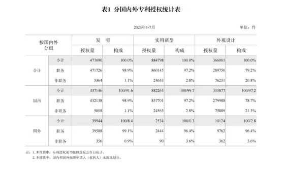 近日,国家知识产权局发布了2025年7月国家知识产权局审查注册登记统计月报。相较于2024年1-7月,2025年1-7月发明专利授权量同比减少26.59%,实用新型同比下降24.69%,外观设计增加2.05%。