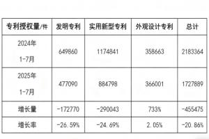 近日,国家知识产权局发布了2025年7月国家知识产权局审查注册登记统计月报。相较于2024年1-7月,2025年1-7月发明专利授权量同比减少26.59%,实用新型同比下降24.69%,外观设计增加2...